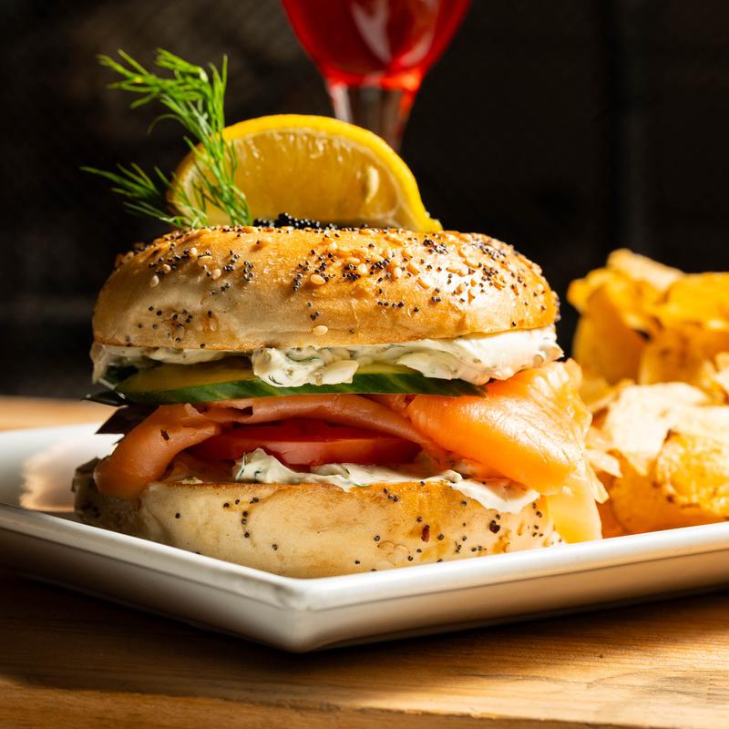 Real NY every seed bagel, whipped cream cheese, sliced cured salmon, cucumber, tomato, red onion, capers, dill, side salad, caviar and lemon garnish